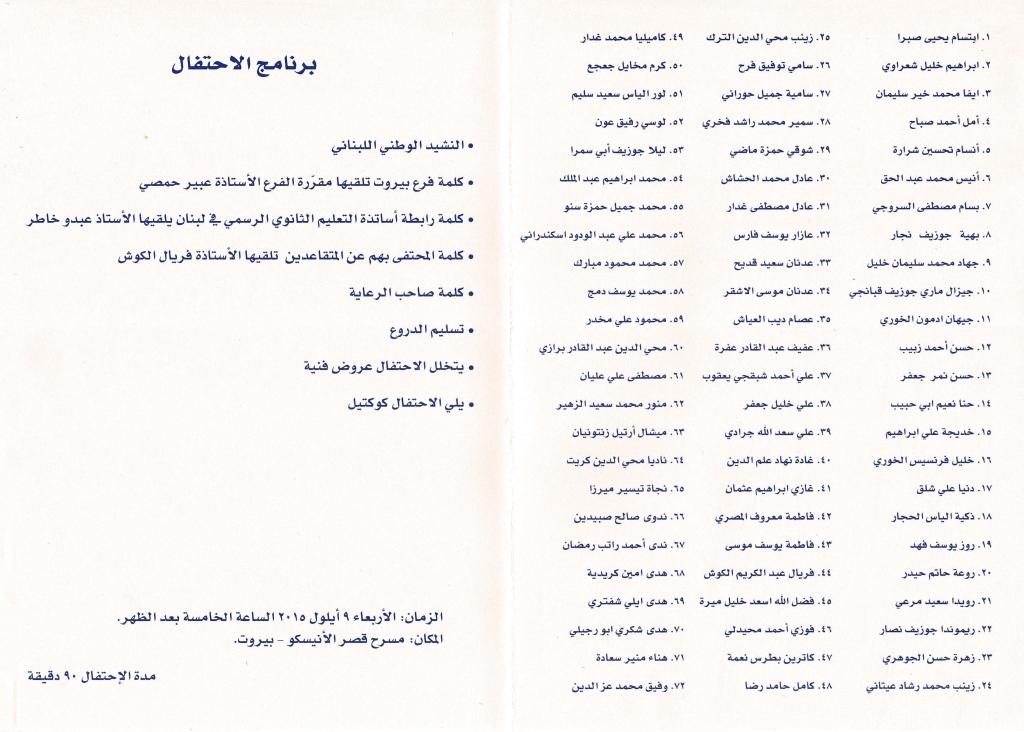 دعوة لحضور الإحتفال التكريمي للأساتذة المُتقاعدين برعاية الوزير أبو صعب مقالات مشابهة إعلان دورة تقنيات ومناهج البحث العلمي من تنظيم جمعية رسالتنا وإعداد مدرب التنمية البشرية الأستاذ محمد مدلل ووكالة أنباء العاصفة العربية الراعي الإعلامي 11/26/2017 ثانوية جبران أندراوس التويني تنظم نشاطاً تربوياً عنوانه اليوم العالمي بحضور المُلحق الثقافي الصيني 05/09/2017 مشروع رياضي مُشترك يجمع ثانويتا التويني والسانت جوريف على ملعب جامعة “AUL” 04/04/2017 مهرجان الربيع الأول يُزهر في الجامعة اللُبنانية كلية الإعلام 03/30/2017 إطلاق موقع “Darasna” في معرض الكتاب العربي ــ البيال 12/23/2016 دعوة لحضور الإحتفال التكريمي للأساتذة المُتقاعدين برعاية الوزير أبو صعب شاركها tweet