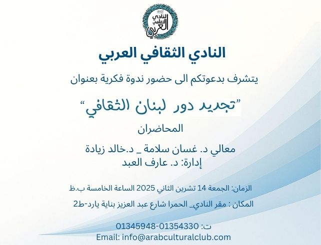النادي الثقافي العربي ــ دعوة لحضور ندوة فكرية بعنوان تجديد دور لُبنان الثقافي 11/08/2025 634 زيارة مقالات مشابهة النادي الثقافي العربي ــ دعوة لحضور ندوةفكرية بعنوان: موسيقية 11/25/2025 النادي الثقافي العربي ــ دعوة لحضور ندوة فكرية بعنوان: في ذكرى الإستقلال ــ معنى أن تكون لُبنانياً اليوم 11/20/2025 النادي الثقافي العربي ــ دعوة للمشاركة في حفل إفتتاح معرض بيوت بيروت للفنان التشكيلي جورج مطر 11/19/2025 زاوية تشكيلية يفتح أبوابهُ في معرض بيروت العربي الدولي بلا قيود 12/03/2015 فاديا المقطرن حسين نهَّابة وليندا عبد الباقي وقعوا كُتبهم في جناح النادي الثقافي العربي في معرض البيال 12/12/2014 شاركها tweet