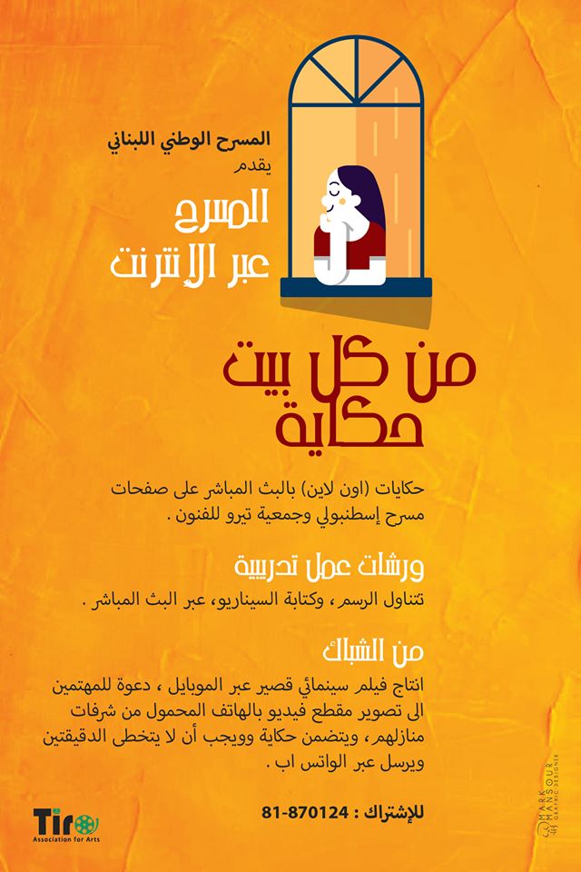 أطلقت إدارة “مسرح إسطنبولي” وجمعية تيرو للفنون” والمسرح الوطني البناني” عروضاً حكواتية “لايف” عبر الإنترنت تحت شعار”من كل بيت حكاية” وذلك بالبث المباشر عبر الفيسبوك من الحكواتيين الى المنازل ضمن برنامج “المسرح والسينما عبر الإنترنت”، والذي يتضمن اقامة ورشات عمل تدريبية للأطفال، والشباب، تتناول الرسم، وكتابة السيناريو، عبر الإنترنت، الى جانب تنفيذ مشروع “من الشباك” الذي يتضمن انتاج فيلم سينمائي قصير عبر الموبايل، مع دعوة المهتمين إلى تصوير مقطع فيديو بالهاتف المحمول من شرفات منازلهم، على أن يتضمن الشريط: “قصة، أو أغنية، أو قصيدة، أو عزفاً للموسيقى”، ويجب أن لا يتخطى الدقيقتين.